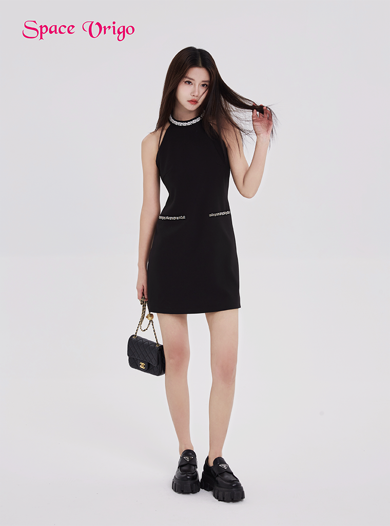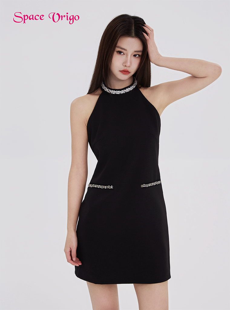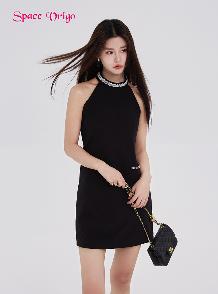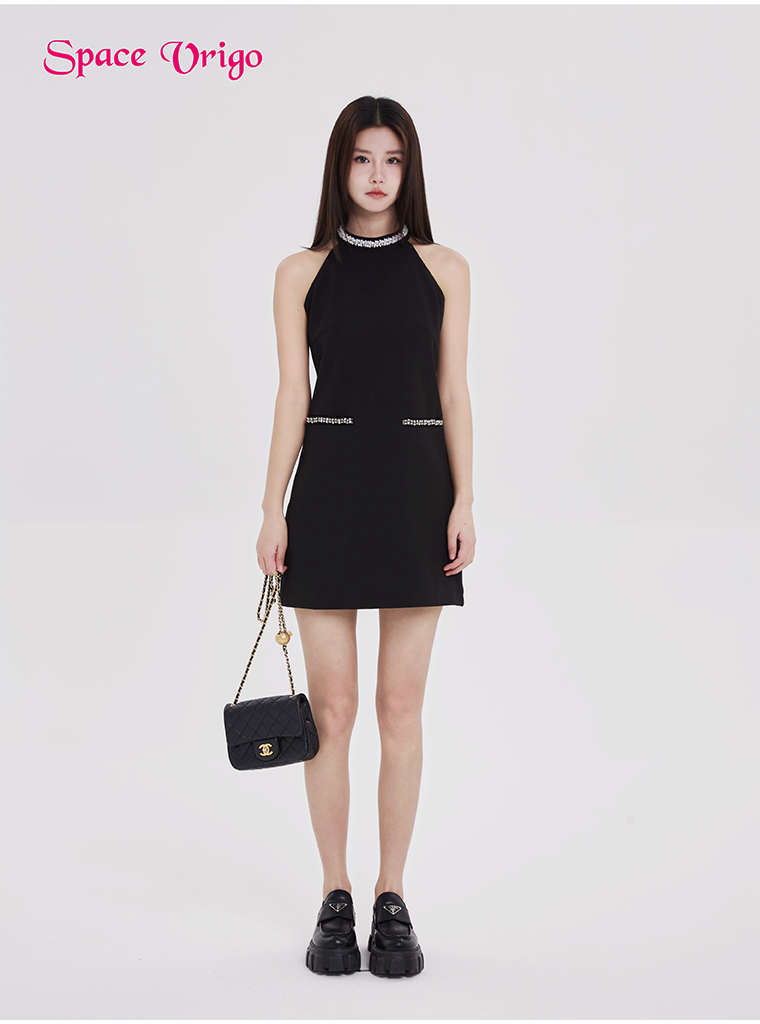 轻奢25早春圣诞元旦新年节日礼服裙法式时尚钻饰黑色挂脖短裙钻边