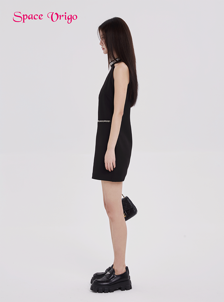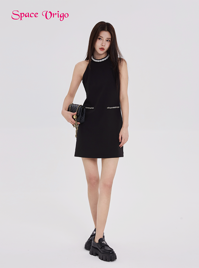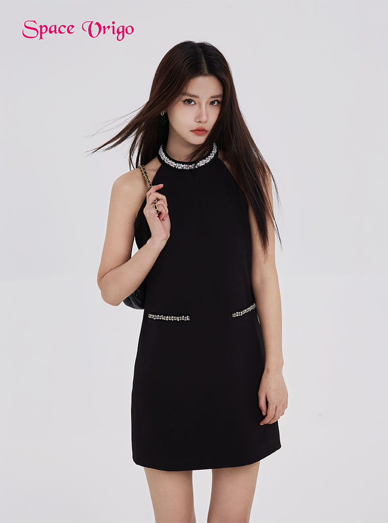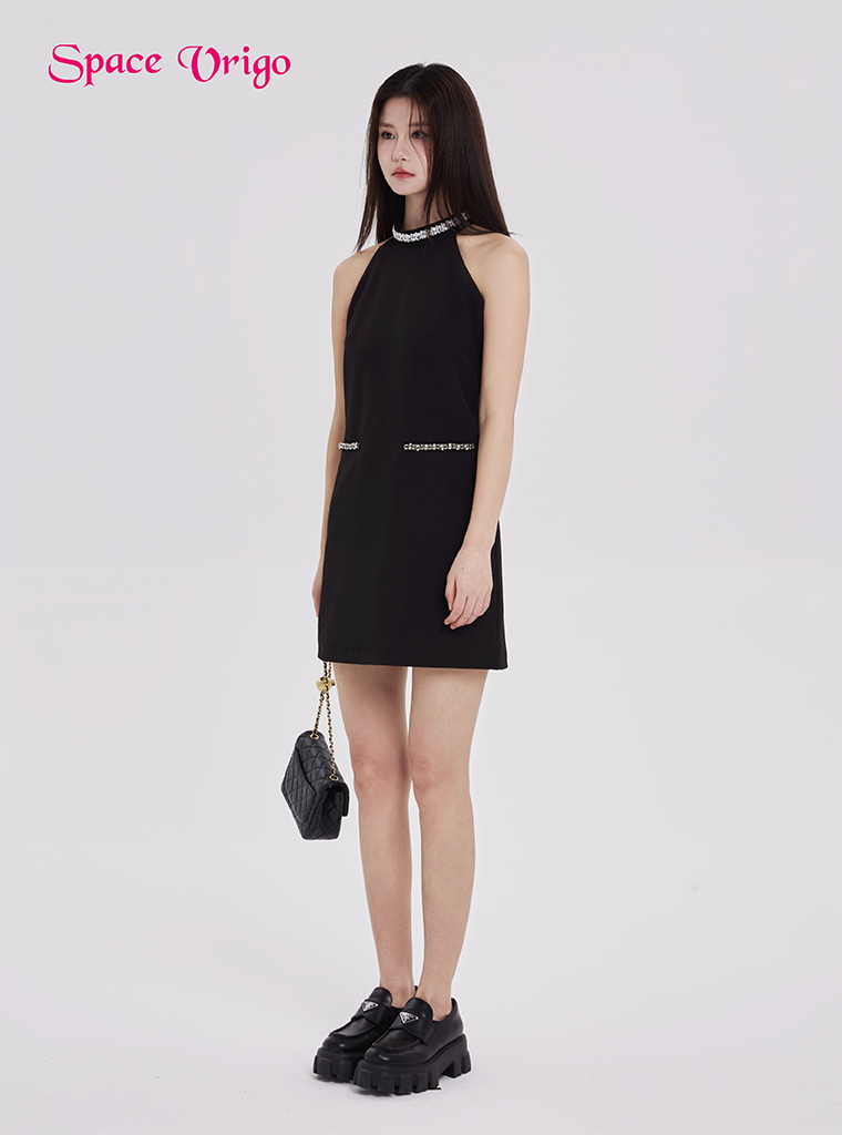 轻奢25早春圣诞元旦新年节日礼服裙法式时尚钻饰黑色挂脖短裙钻边